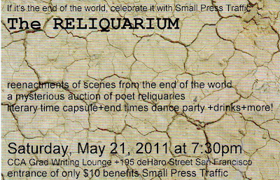 Some people think that May 21st is the end of the world! Regardless, we'll be partying down at Small Press Traffic's 2nd Annual Reliquarium. You can bid on mysterious bottles filled with secret ingredients from some of your favorite authors and artists. There will be music, dancing, apocalyptic film scenes, drinks and more!